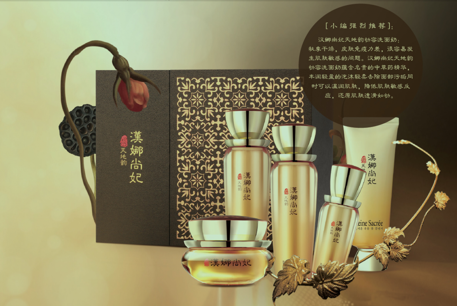 締造陰陽平衡的醇真幼容肌: 漢娜尚妃天地韻幼容護膚系列采用32味珍貴的中草藥匯集成養顏古方天地丹,可令肌膚深層陰陽平衡、氣血津液調和,深入調理并改善肌膚多重問題,同步解決抗衰、緊致、亮膚、保濕、鎮靜五大肌膚問題。 |