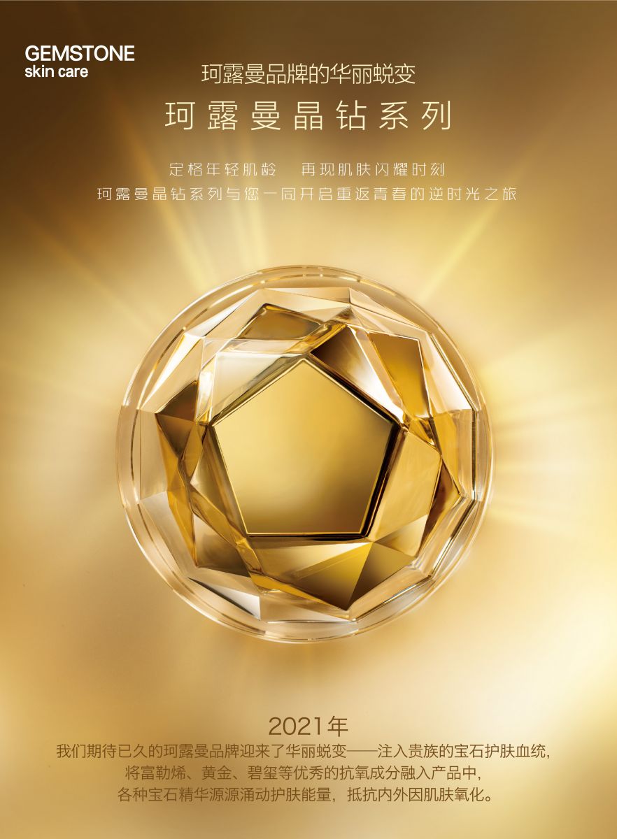 2021年 我們期待已久的珂露曼品牌迎來了華麗蛻變——注入貴族的寶石護膚血統,將富勒烯、黃金、碧璽等優秀的抗氧成分融入產品中, 各種寶石精華源源涌動護膚能量,抵抗內外因肌膚氧化。