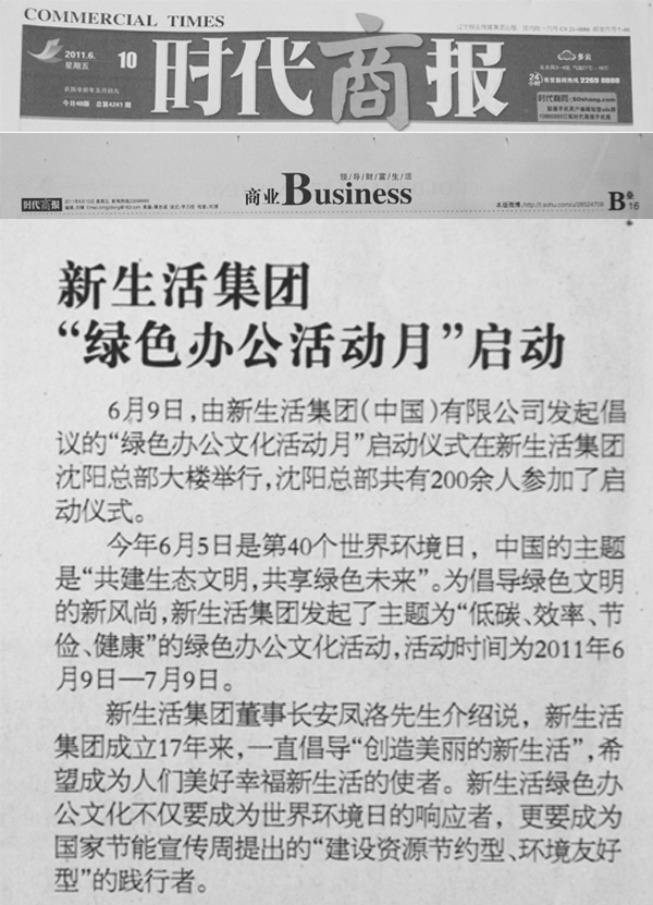 今年6月5日是第40個世界環境日,中國的主題是“共建生態文明,共享綠色未來”。為倡導綠色文明的新風尚,新生活集團發起了主題為“低碳、效率、節儉、健康”的綠色辦公文化活動,活動時間為2011年6月9日—7月9日。