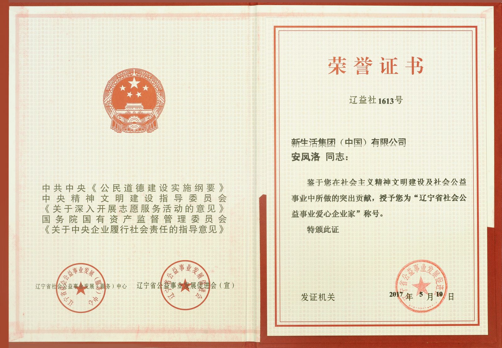 近日,新生活集團(tuán)董事長安鳳洛被遼寧省社會(huì)公益事業(yè)發(fā)展(服務(wù))中心及遼寧省公益事業(yè)發(fā)展促進(jìn)會(huì)評(píng)為“遼寧省社會(huì)公益事業(yè)愛心企業(yè)家”榮譽(yù)稱號(hào)。