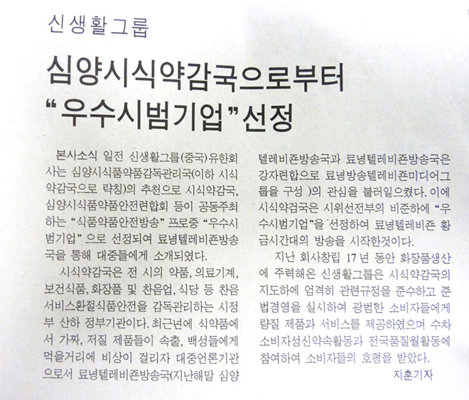 [遼寧朝鮮文報(bào)]新生活被食藥監(jiān)局列評(píng)為“優(yōu)秀示范企業(yè)”