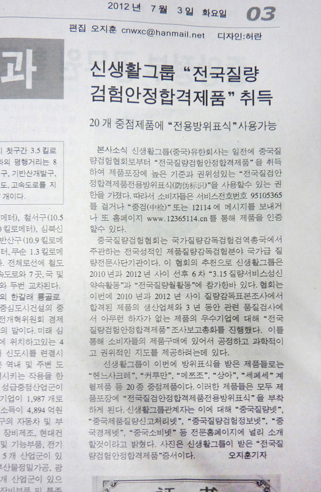 [遼寧朝鮮文報]新生活集團榮獲“全國質量檢驗穩定合格產品”稱號