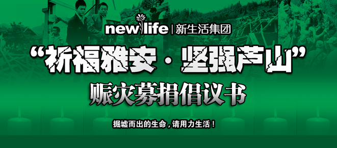 新生活集團(tuán)作為正直的、分享愛心的企業(yè),從成立之初就為把部分企業(yè)利潤還原于社會而積極行動(dòng)著。此次的雅安的災(zāi)情一直牽動(dòng)著新生活集團(tuán)所有人的心,地域沒有界限,時(shí)間就是生命,愛心就是希望,新生活人必將迅速行動(dòng)起來!同心協(xié)力,攜手并肩,在危難中托起愛的方舟,用博愛的胸懷鑄就世間的真情,用奉獻(xiàn)的行動(dòng)拯救寶貴的生命!