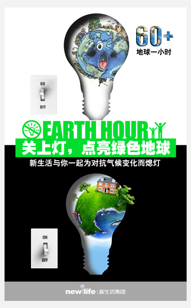 2013年3月23日晚8時30分(2013年因與復活節日期沖突,故提前至3月23日),新生活集團(中國)有限公司積極參與了由世界自然基金會(WWF)發起的“地球一小時”活動,將集團上下的用電設備(除必要的燈光和用電設備)關閉一小時,以此來響應此次活動。這雖然是新生活集團(中國)有限公司第一次參加“地球一小時”活動,但卻不是第一次參加環保活動。