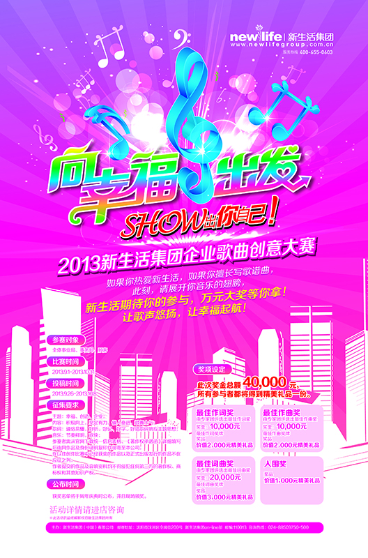 熱愛(ài)詞曲創(chuàng)作的你快點(diǎn)通過(guò)這樣的機(jī)會(huì)展示你的音樂(lè)才華吧!拿起你的筆,感受你的心,譜寫(xiě)你的心聲來(lái)傳達(dá)新生活集團(tuán)的企業(yè)精神,放飛你的音樂(lè)夢(mèng)想,共筑新生活絢麗篇章!