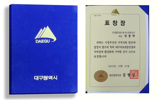 日前,新生活集團董事長安鳳洛先生收到了來自韓國大邱廣域市長金范鎰親手簽寫的感謝狀,其中感謝安鳳洛董事長長期以來,站在大邱市政推進、地域發展和中韓 友誼的高度,對韓國大邱市醫療和觀光產業以及大邱地域經濟活躍化所做出的特別貢獻。此次感謝狀的獲得,代表了韓國政府對安鳳洛董事長和新生活集團支援大邱 市社會發展和推動中韓兩國經濟、文化交流的充分肯定,是新生活集團再接再厲、承擔社會責任、為中韓交流再做貢獻的動力。