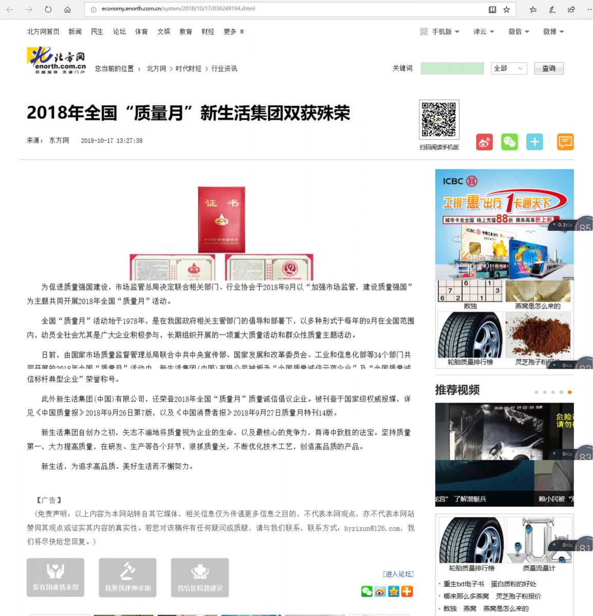(網(wǎng)絡(luò)媒體)2018年全國“質(zhì)量月”新生活集團(tuán)雙獲殊榮