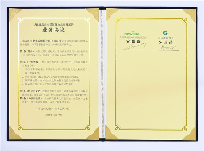 2015年10月19日,新生活集團(中國)有限公司與韓國慶山市為促進慶山市國際化妝品谷的發(fā)展,簽訂了業(yè)務協(xié)議。雙方將就慶山市國際化妝品谷的投資、化妝品的研發(fā)、技術交流及市場開拓與人才的培養(yǎng)等方面進行緊密合作。新生活集團(中國)有限公司董事長安鳳洛與慶山市相關政府官員出席了當天的簽約儀式。