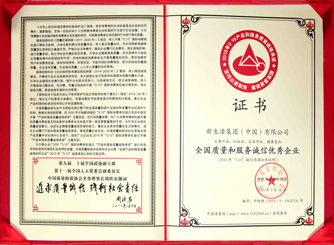 新生活集團榮獲“全國質量和服務誠信優秀企業”榮譽證書