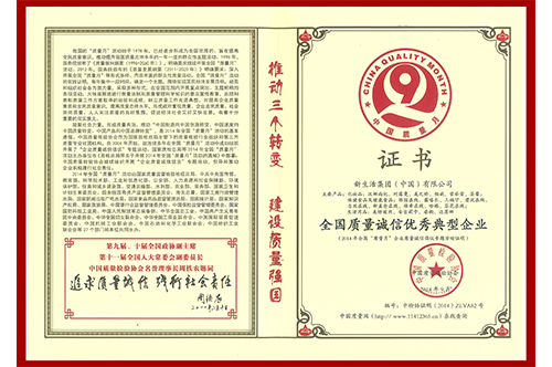 2014年 “企業質量誠信倡議”專題活動由國家質量監督檢驗檢疫總局、中共中央宣傳部、教育部、科學技術部、工業和信息化部、公安部、人力資源部和社會保障部、環境保護部、住房和城鄉建設部、交通運輸部、水利部、農業部、商務部等37個單位和部門共同主辦。凝聚社會力量,形成質量共治,推動“中國制造向中國創造改變、中國速度向中國質量轉變、中國產品向中國品牌轉變”,是2014年“質量月”活動的基本遵循。在本次“質量月”專題活動中,新生活集團(中國)有限公司獲得了“全國質量誠信優秀典型企業”榮譽稱號