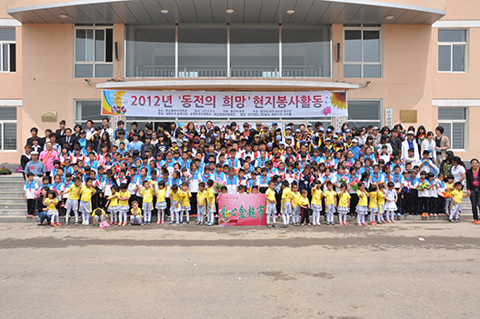 “零錢的希望”活動(dòng)機(jī)構(gòu)志愿者與貧困小學(xué)生合影