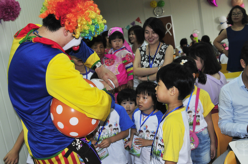活動中還為小朋友準備了捏彩泥的游戲環節,每個小朋友都會按照桌子上擺放的任務卡捏出所要求的化妝品容器。正當孩子和家長沉浸在捏彩泥的樂趣中時,有一個更大的驚喜正在悄悄的到來。伴隨著音樂的想起,小丑哥哥來到了孩子們的身邊。他的雙手就像被施了魔法一樣,氣球在他的手中不一會就變成了手槍、葡萄、花籃、小狗、小花……孩子們都圍在小丑哥哥的身旁等待著屬于自己的禮物。拿著剛剛到手的禮物,和家人一同合影留念,誰能說這個上午過得不難忘呢。